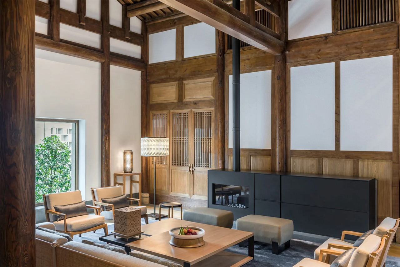 寬敞起居室位於矗立在院落中心的古宅內,四座現代臥室則位於四周新式廂房中