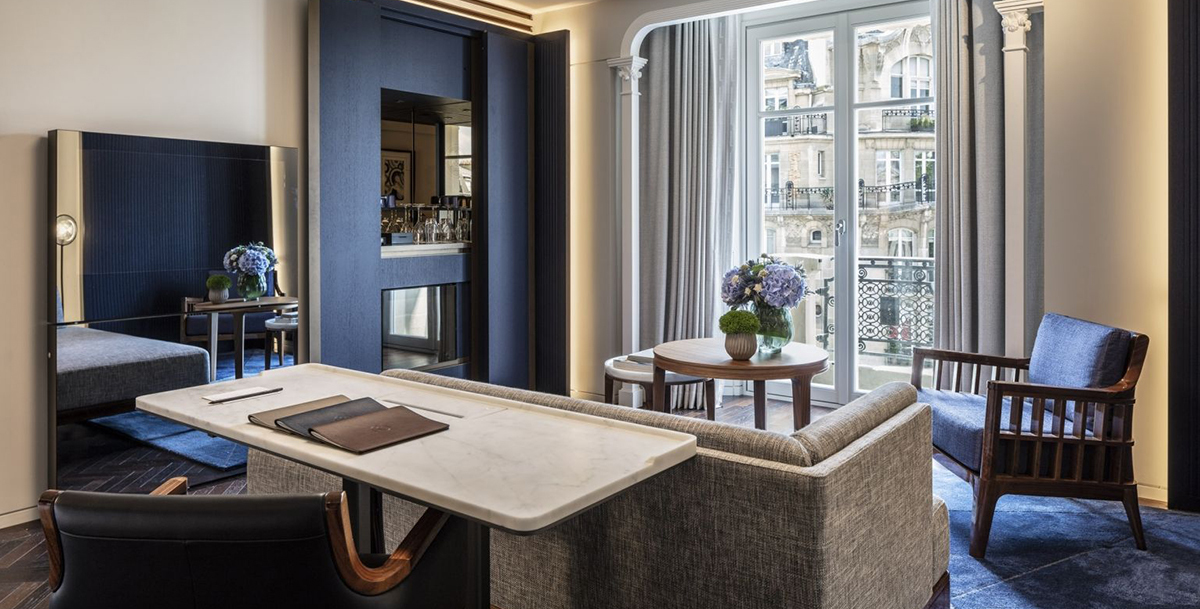 小型套房裝飾精緻典雅,設有帶餐桌和書桌的迷人休息區。高貴的用料打造出法式奢華的寧和之地。雪花白大理石浴室沐浴在自然光線中,並提供愛馬仕洗浴用品。