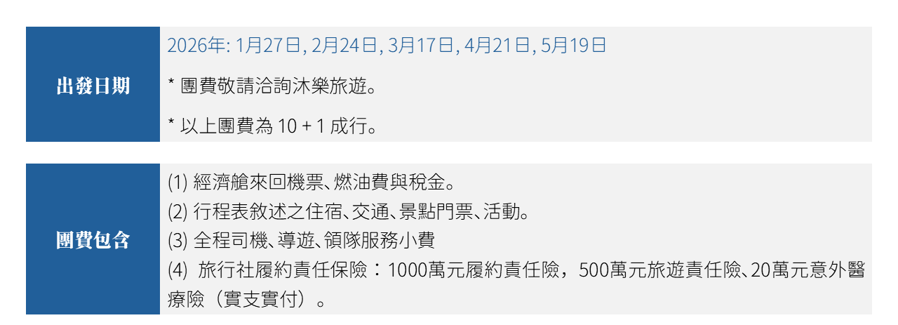 📅 出發日期|2026年: 1月27日, 2月24日, 3月17日, 4月21日, 5月19日