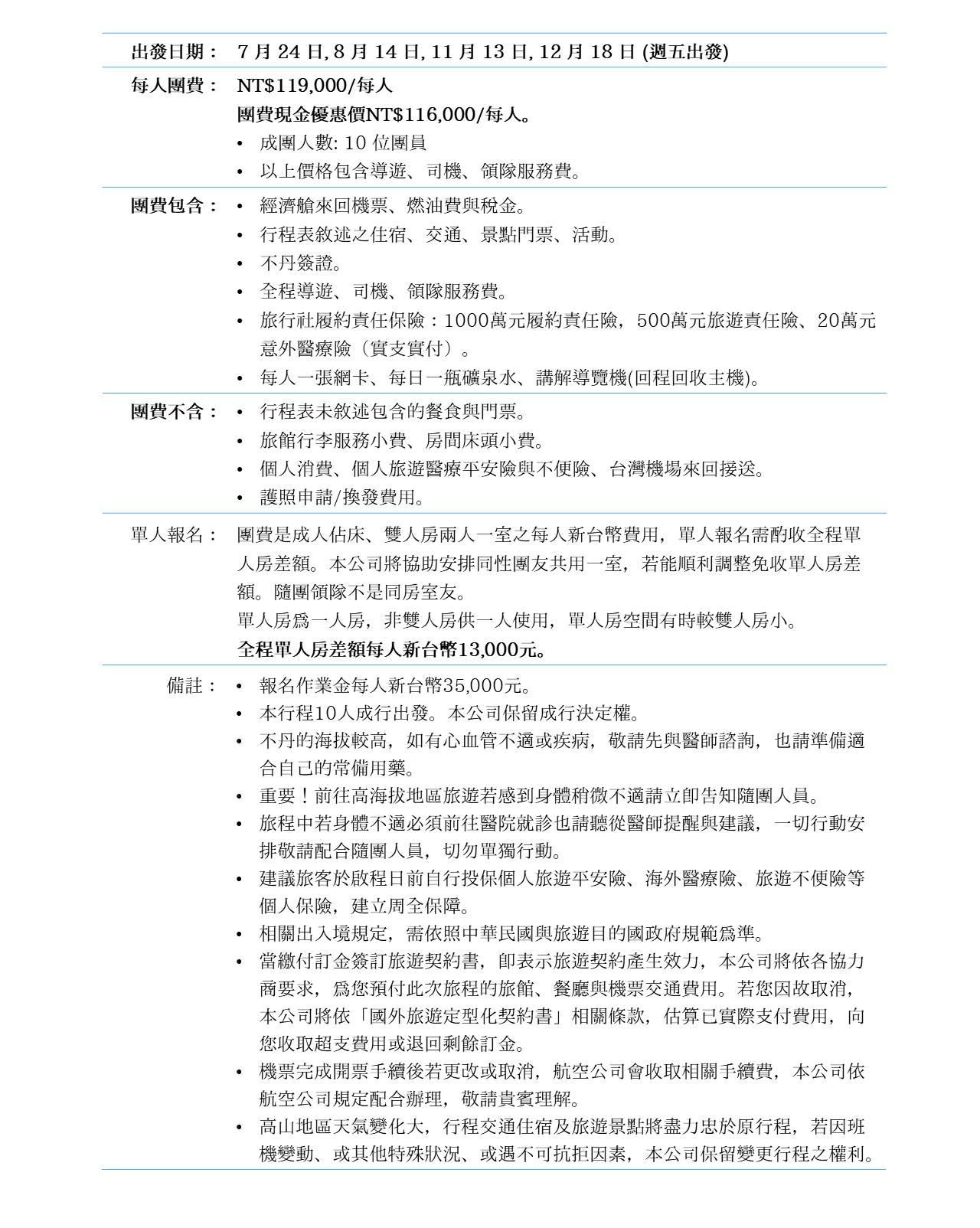 出發日期∣7 月 24 日, 8 月 14 日, 11 月 13 日, 12 月 18 日 (週五出發)