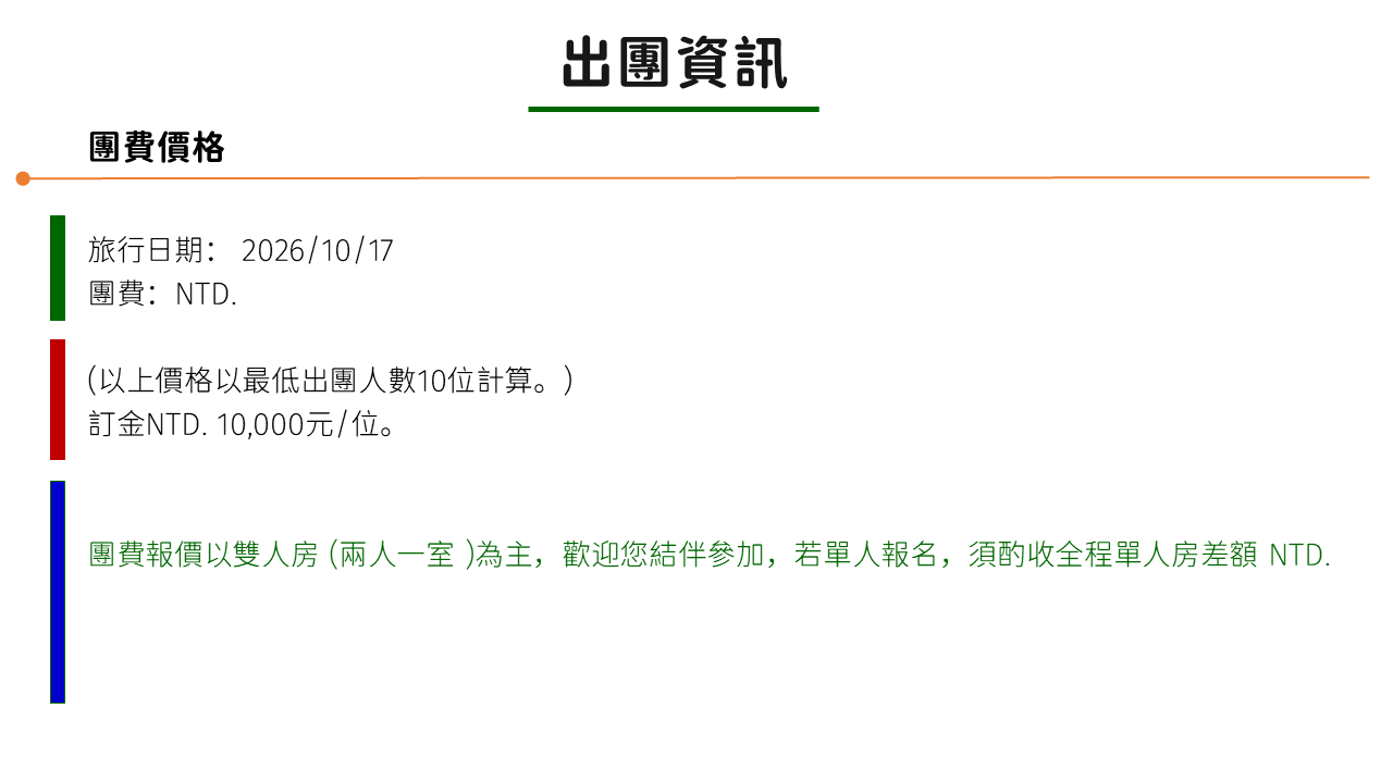 ※配合政府政策,大陸線散客組團未開放,若有整團文化交流需求,可參考此行程內容。