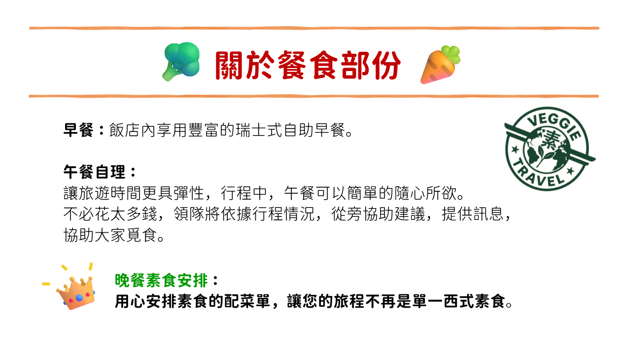 全程安排素食餐,讓茹素的您,也能在旅途中盡享美食。