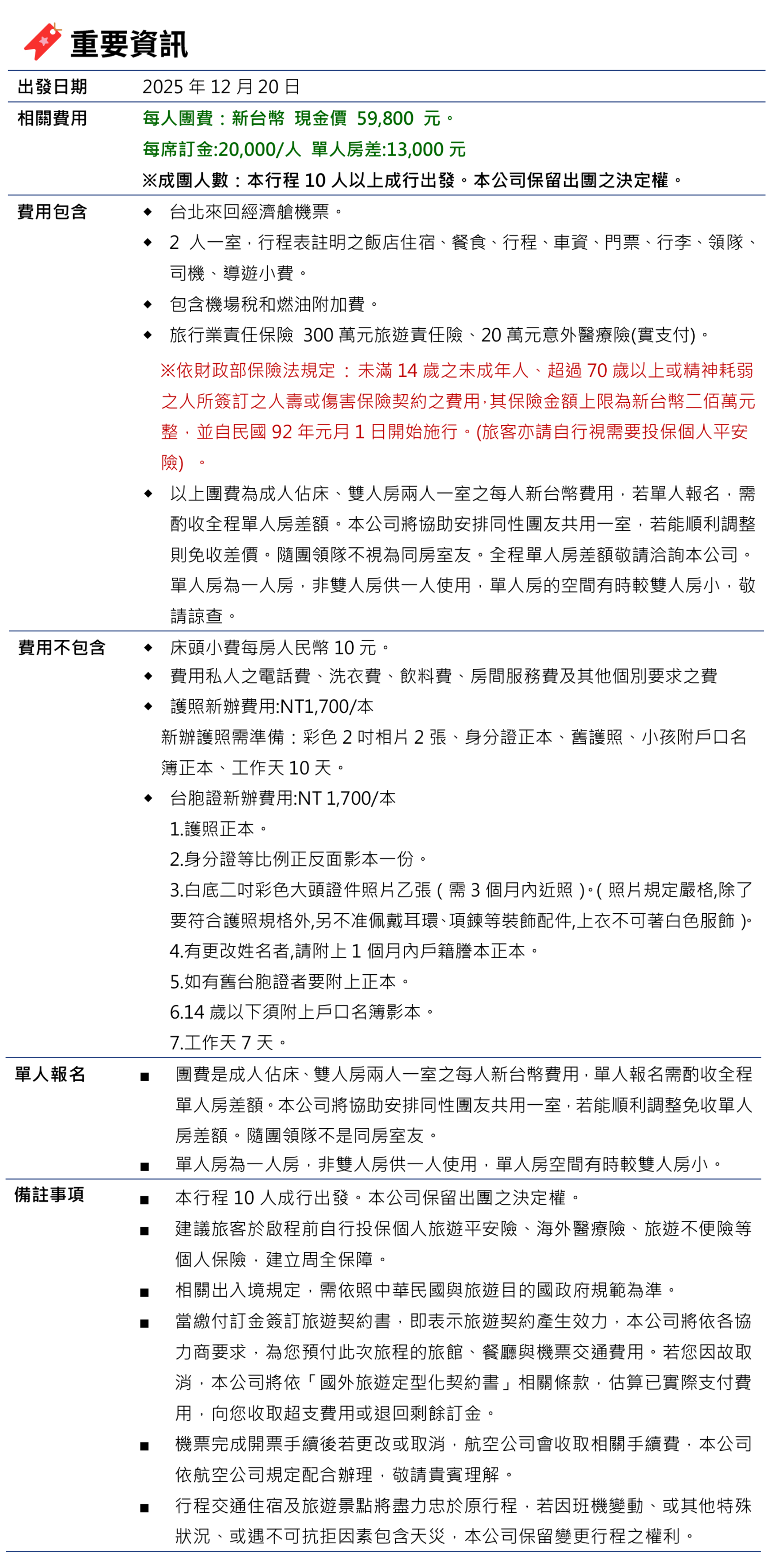 【早鳥優惠】2025年8月31日前報名付訂,贈全程司機導遊領隊小費(價值2,700/人)。